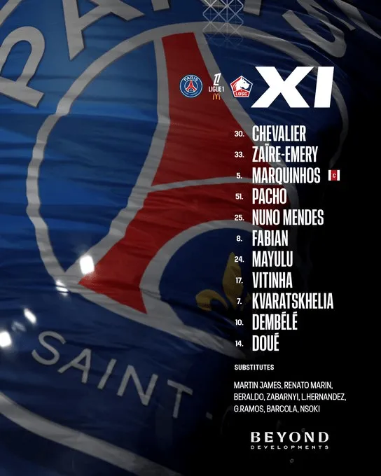 巴黎首发:30-舍瓦利埃、33-扎伊尔-埃梅里、5-马尔基尼奥斯、51-威廉-帕乔、25-努诺-门德斯、8-鲁伊斯、24-马尤鲁、17-维蒂尼亚、7-克瓦拉茨赫利亚、10-奥斯曼-登贝莱、14-杜埃